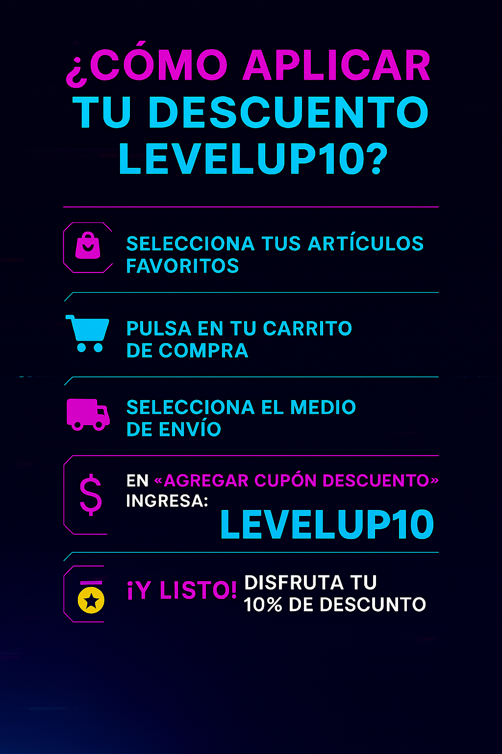 10 % de descuento en tu primera compra usando el cupon LEVELUP10
